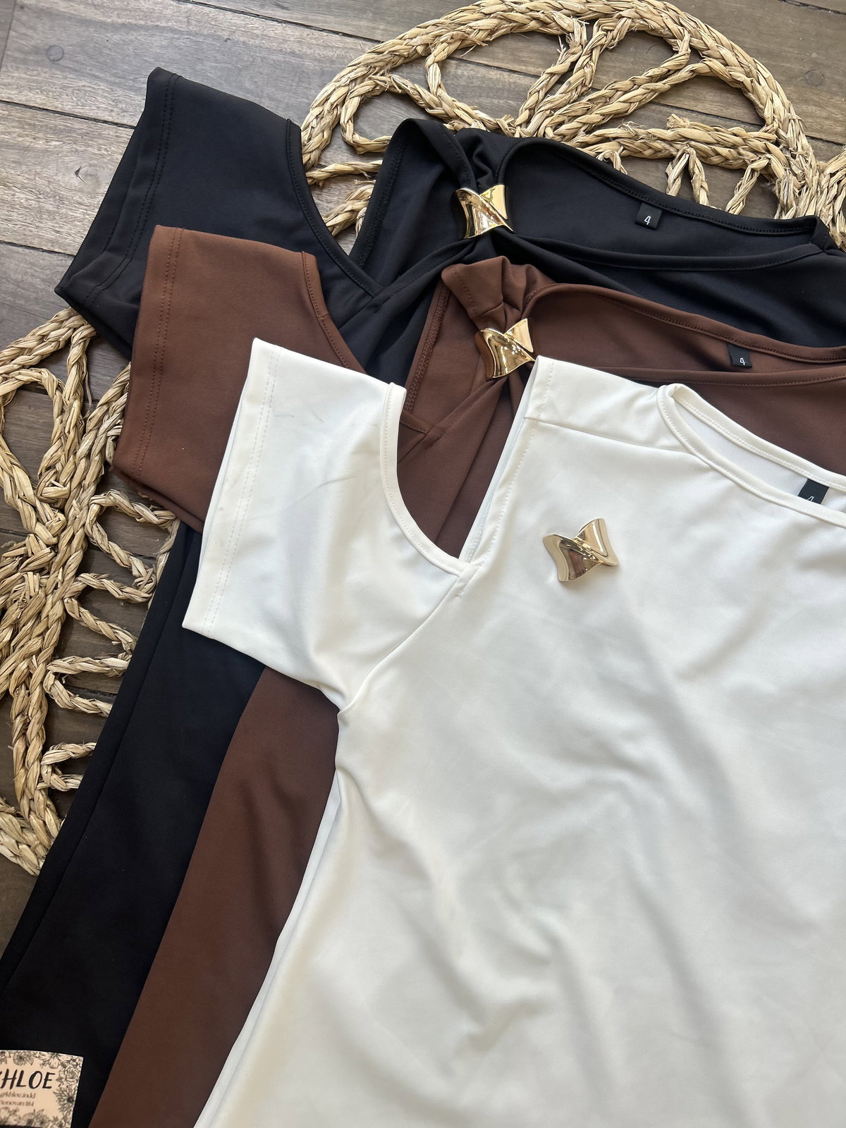 Incluye un aplique dorado geométrico desmontable. Ponelo para un evento, sacalo para un look más minimal.