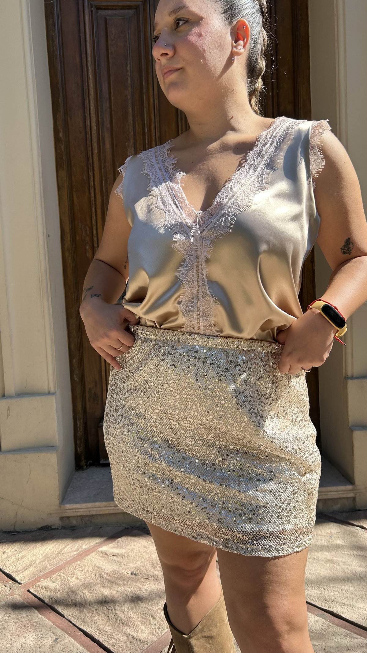 Elevá tu look de noche con nuestra mini de lentejuelas. Diseñada para ser la protagonista, esta prenda combina el brillo intenso con un tono champagne sofisticado que va con todo. Su corte clásico se adapta al cuerpo resaltando tu silueta, ideal para bailar toda la noche o para un evento especial donde quieras deslumbrar.