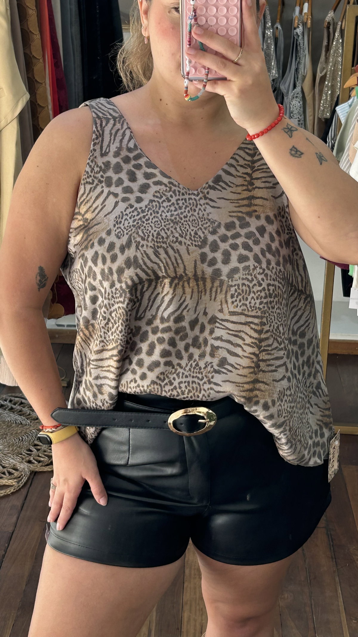 Decile "hola" a tu nuevo básico con onda. Esta musculosa no es una más, es EL mix que necesitabas para elevar cualquier fit. Combinamos leopardo, cebra y tigre en un print súper cool y fluido.