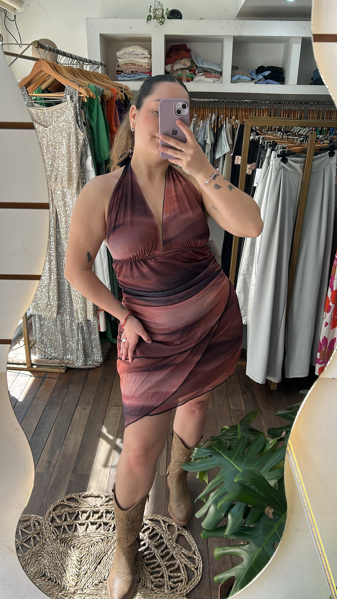 Sensualidad y tendencia en una sola prenda. Este vestido destaca por su diseño audaz y su estampado en degradé que evoca los colores del atardecer. Es la pieza clave para un look de noche con mucha actitud.