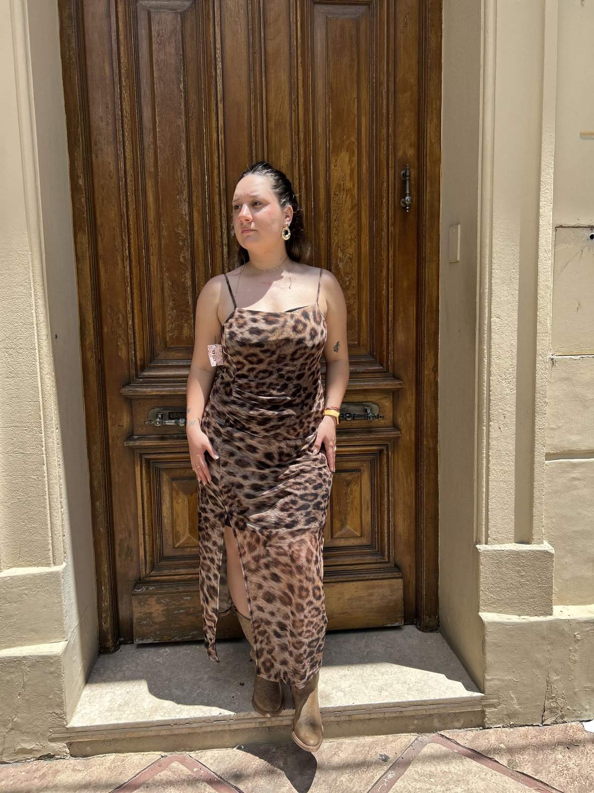 Buscamos el vestido con el calce ideal y lo encontramos. Lo que hace único a este modelo es su moldería inteligente: el drapeado frontal en la panza es clave para sentirte cómoda y segura toda la noche, mientras que el tajo profundo estiliza las piernas al infinito.